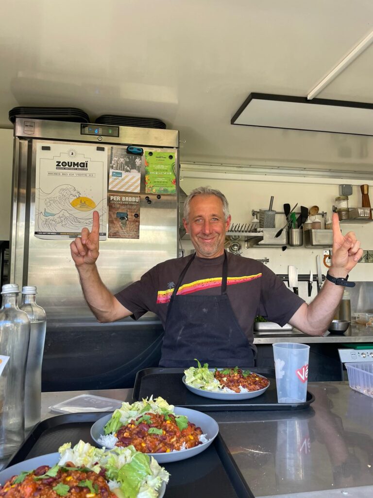 Injonction Marseillaise bien connue, destinée à attirer l’attention et éveiller la curiosité. Vé! C’est une remorque foodtruck et c’est Steph qui cuisine.