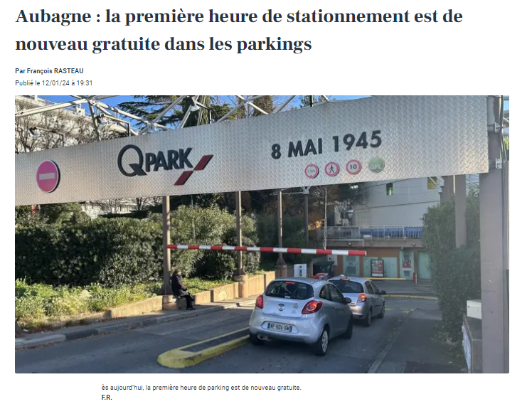 La Provence : Article du 12 Janvier 2024 : Aubagne : la première heure de stationnement est de nouveau gratuite dans les parkings.