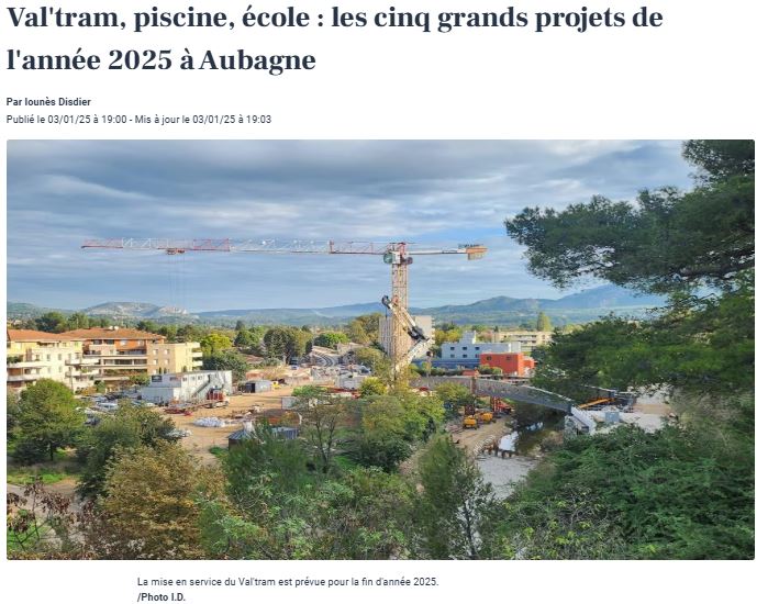 Article de La Provence Publié le 03/01/25 : « Val’tram, piscine, école : les cinq grands projets de l’année 2025 à Aubagne »