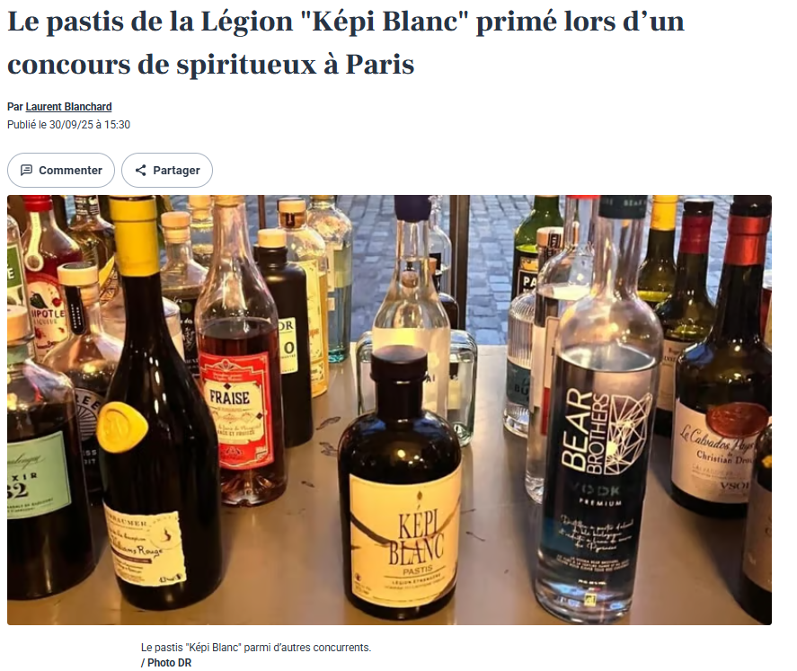 Article de La Provence Publié le 30/09/2025: « Le pastis de la Légion « Képi Blanc » primé lors d’un concours de spiritueux à Paris »