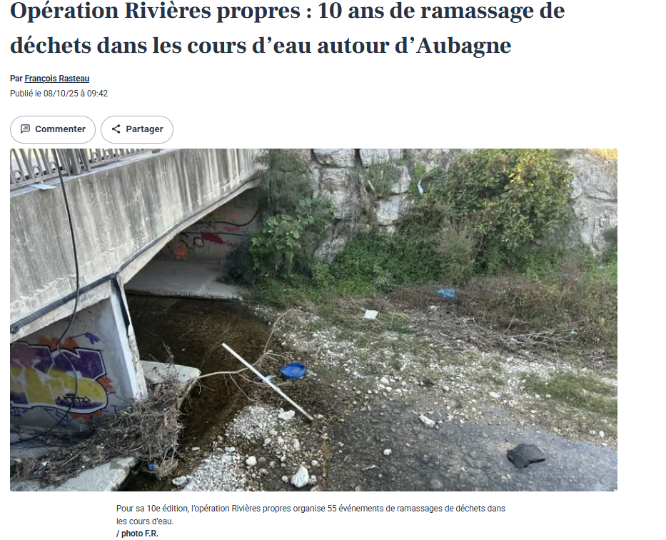 Article de La Provence Publié le 08/10/2025: « Opération Rivières propres : 10 ans de ramassage de déchets dans les cours d’eau autour d’Aubagne »